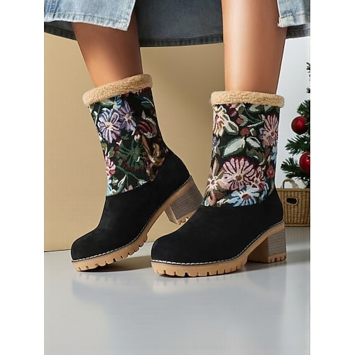 stivaletti caldi da donna con polsino in pelliccia sintetica e dettagli in maglia floreale - scarpe invernali con tacco spesso antiscivolo per outfit casual adatti al freddo