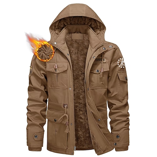 Herren 1776 Fleecejacke Cargo-Jacke Windbreaker Thermowarm Lässig Militär Outdoor Campen und Wandern Bestickt Abnehmbare Kapuze Mit Kapuze Winter Stehkragen Langarm Schwarz Kaki Armeegrün