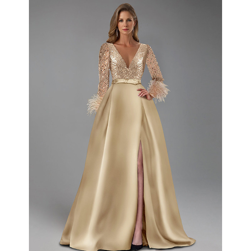 A-Line Floor Length Evening Gown Ball Gown Formal Dress Elegant High Split Long Sleeve V Neck Christmas Formal Champagne Mother Of the Bride Dress Sequined with Feather Glitter