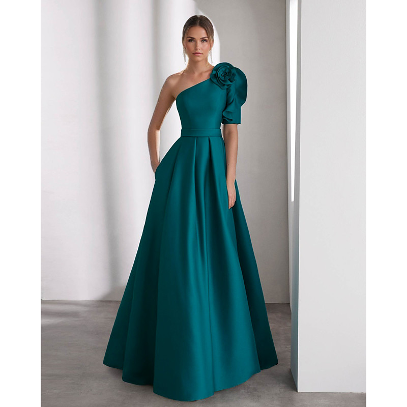 A-Line Floor Length Evening Gown Ball Gown Formal Dress Elegant Color Block Short Sleeve One Shoulder Wedding Formal Champagne Mother Of the Bride Dress Satin with Shouder Flower