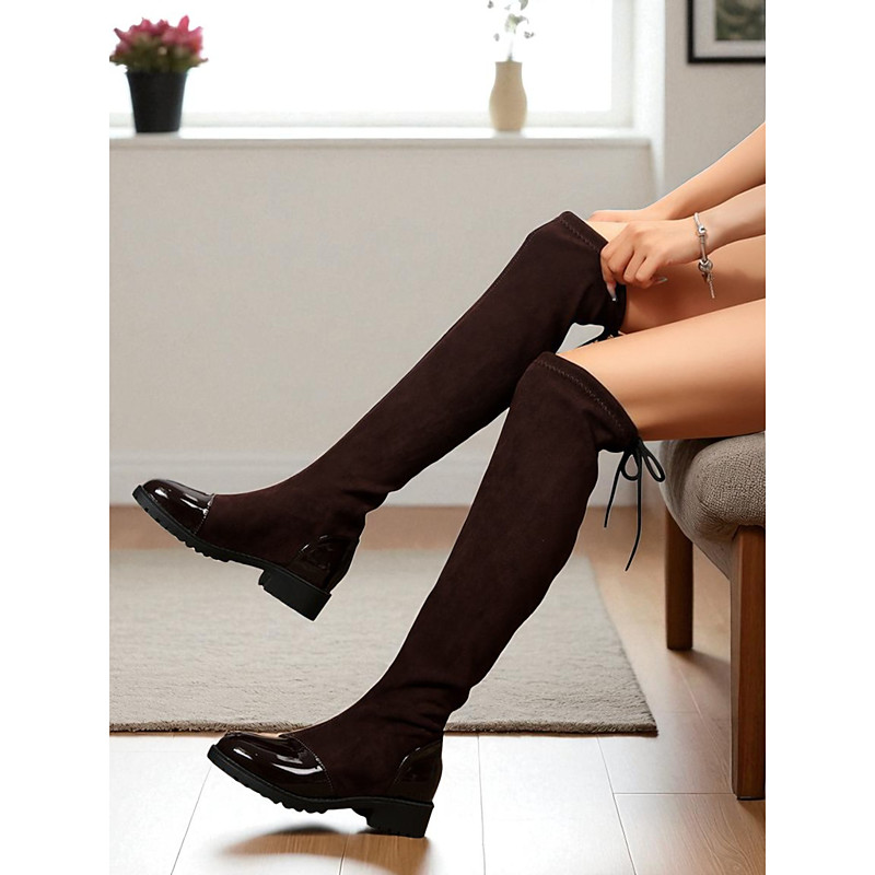Women's Black Over the Knee Boots with Patent Leather Toe – Casual Chic Stretch Tall Boots for Daily Wear, Parties and Street Fashion