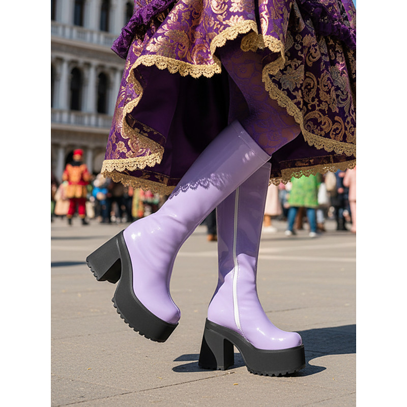Women's Purple Patent Faux Leather Knee-High Platform Boots with Chunky Heel – 70s Retro Style for Carnival, Parties and Costume Events