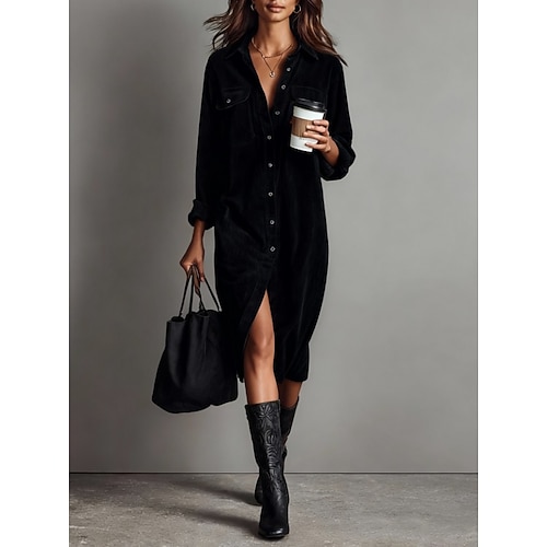vestito midi in velluto a coste da donna, abito a trapezio, casual, boho, da ufficio, quotidiano, per le vacanze, tinta unita, manica lunga, revers, nero, marrone chiaro, autunno inverno