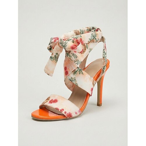 Sandali da donna con tacco alto e lacci floreali, scarpe eleganti con punta aperta e cinturino avvolgente, perfette per feste in giardino e matrimoni. eventi all'aperto