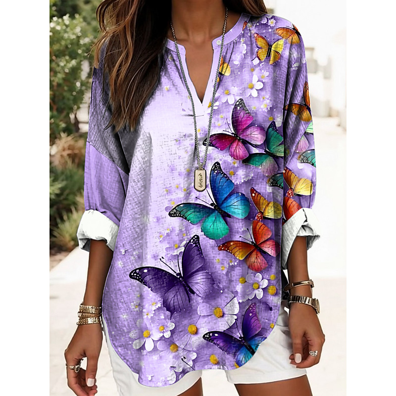 Women's Blouse Tunic V Neck Long Sleeve Boho Casual Tops Summer Tops Floral Graphic Vintage Tropical Regular Tops Daily Wear Print Navy Blue Blue Purple Green Beige