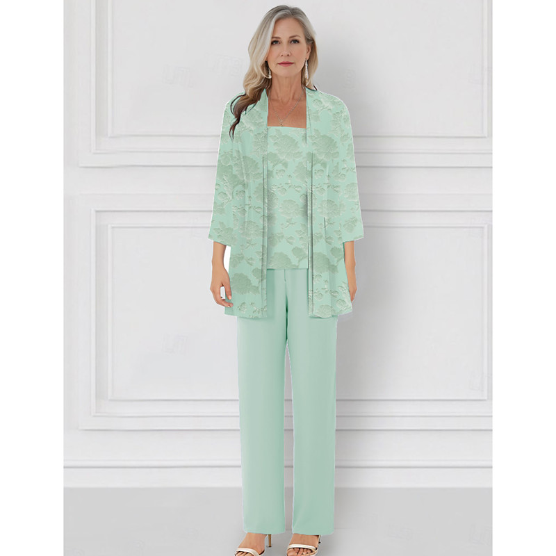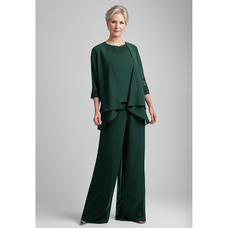 Jumpsuit Pantsuit 3 Piece Floor Length Mother of the Bride Dress 3/4 Length Sleeve Crew Neck Elegant Simple Minimalist Formal Wedding Guest Chiffon with Lace