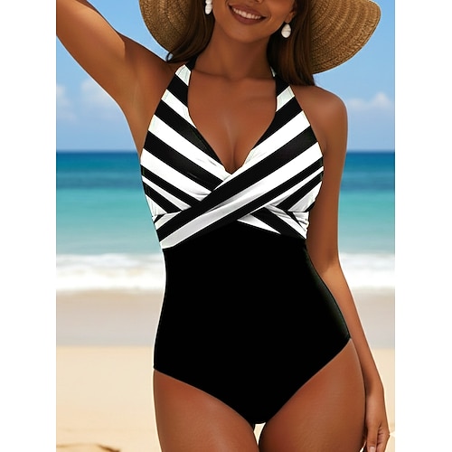 Costume da bagno intero donna snellente monokini colorblock a vita alta con controllo della pancia senza maniche moda vintage ombre grafica scollo a V