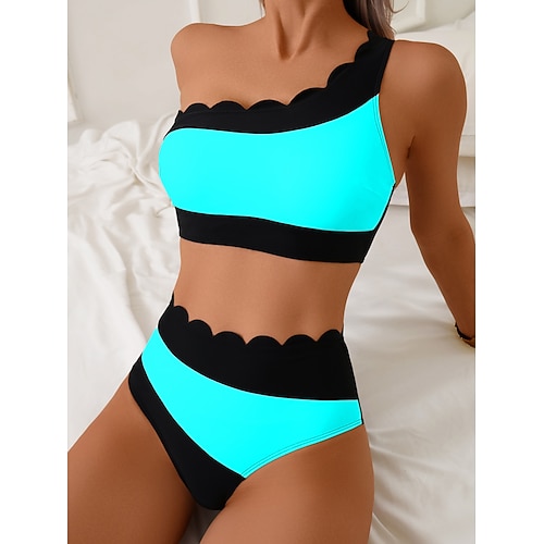 WOMEN'S BIKINI 2 PEZZI COSTUME DA BAGNO CON UNA SPALLA COLOR BLOCK CHEEKY CONTROLLO DELLA PANCIA ALTA VITA SLIM SENZA SCHIENA VACANZA AL MARE UNICO COLORE COLLETTO A V SENZA MANICHE