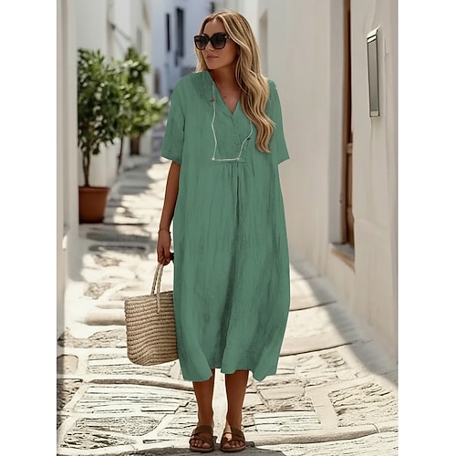 Per donna Abito Midi Finto cotone e lino Abito in cotone e lino Moderno All'aperto Ferie Uscire Vestibilità comoda Semplice Manica Corta Scollo a V Verde chiaro Rosa Verde Cachi Estate Primavera