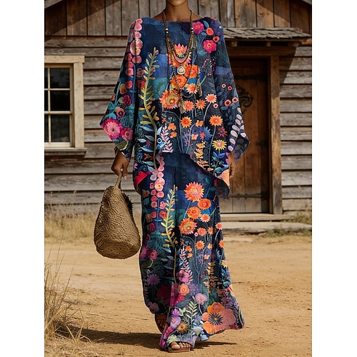 Per donna Abito maxi Abito a trapezio Abito Pieghettato Abito aderente e svasato Boho Data Uscire Vestibilità comoda Floreale Grafico Manica Lunga Scollo a V Viola Marrone Verde Primavera Autunno