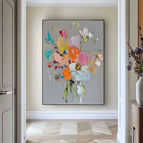 Quadro murale floreale colorato dipinto a mano, lussureggiante bouquet di fiori, dipinto acrilico, vaso astratto colorato, tela artistica per camera da letto