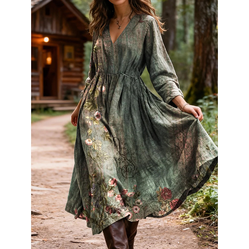 Women's Midi Dress Shift Dress Casual Holiday Going out Regular Fit Floral Graphic Long Sleeve V Neck Blue Dark Red Green Dark Blue Summer Spring