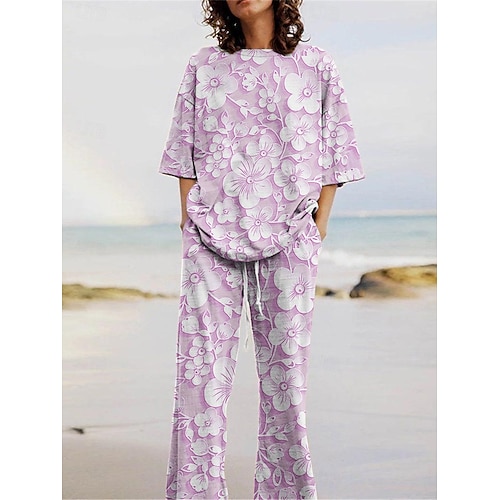 Per donna Attivo Moda Set di Pantaloni Manica 3/4 Girocollo Floreale Stampato Vacanza Quotidiano Ferie Viola Verde Cachi Estate Vestibilità regolare
