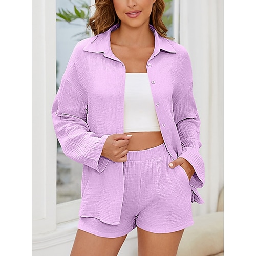 Per donna Set da due pezzi Camicia di cotone Set di Pantaloncini Manica Lunga Colletto a Camicia Semplice Moda Streetwear Casuale Quotidiano All'aperto Bianco Rosa Verde militare Estate Vestibilit