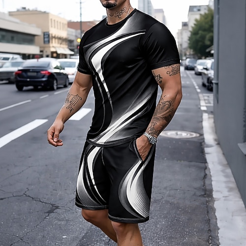 Herren Geometrisch Linie 2St T-Shirts-Sets Sommeroberteile Kurzarm Kurze Hosen Rundhalsausschnitt Sport Lässig Täglich Urlaub Ausgehen 3D-Druck Sommer Blau Schwarz Rote