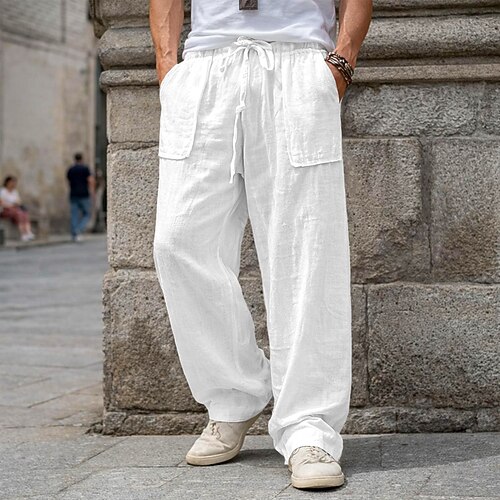 Per uomo Pantaloni di Lino Tinta unica Traspirante Lunghezza intera Formale Matrimonio All'aperto Elegante Vacanza Nero Bianco Micro-elastico
