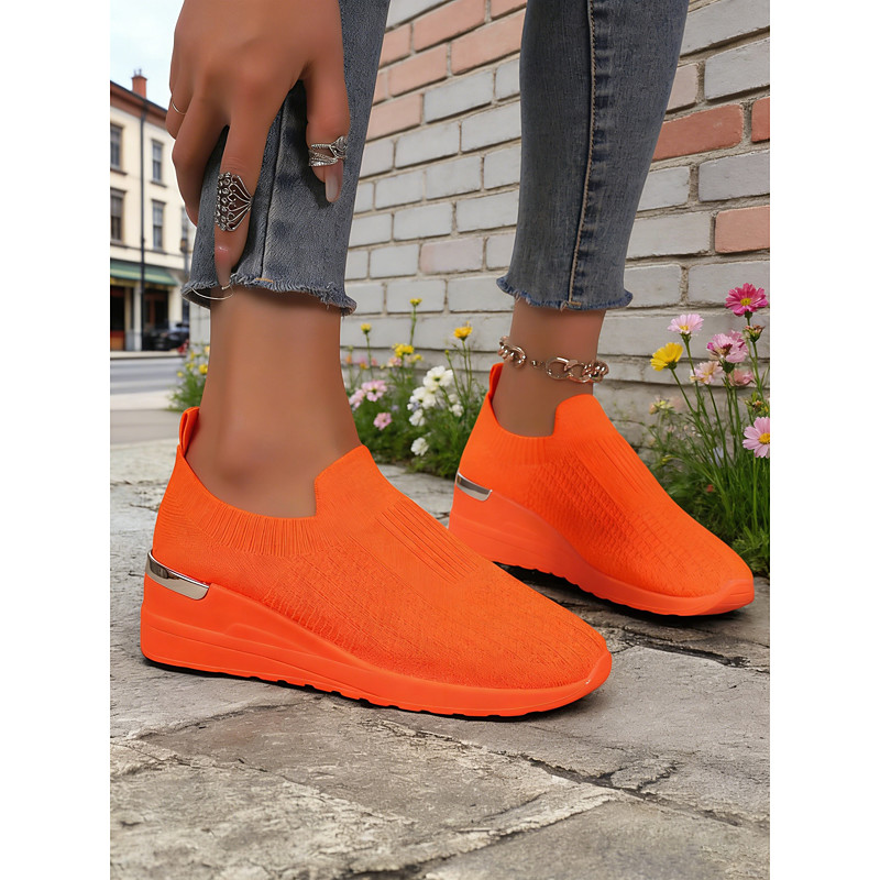 Women's Neon Green Flyknit Slip-On Wedge Shoes - Stretchy Comfort Casual Shoes, Ideal for St. Patrick's Day Parades, Festival Outings, Brunch Dates Daily Errands