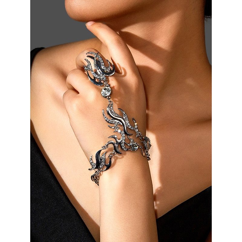 Women's Gold Rhinestone Hand Chain Bracelet Ring Set, Luxury Statement Jewelry with Crystal Flames Design, Perfect for Parties, Galas Evening Events