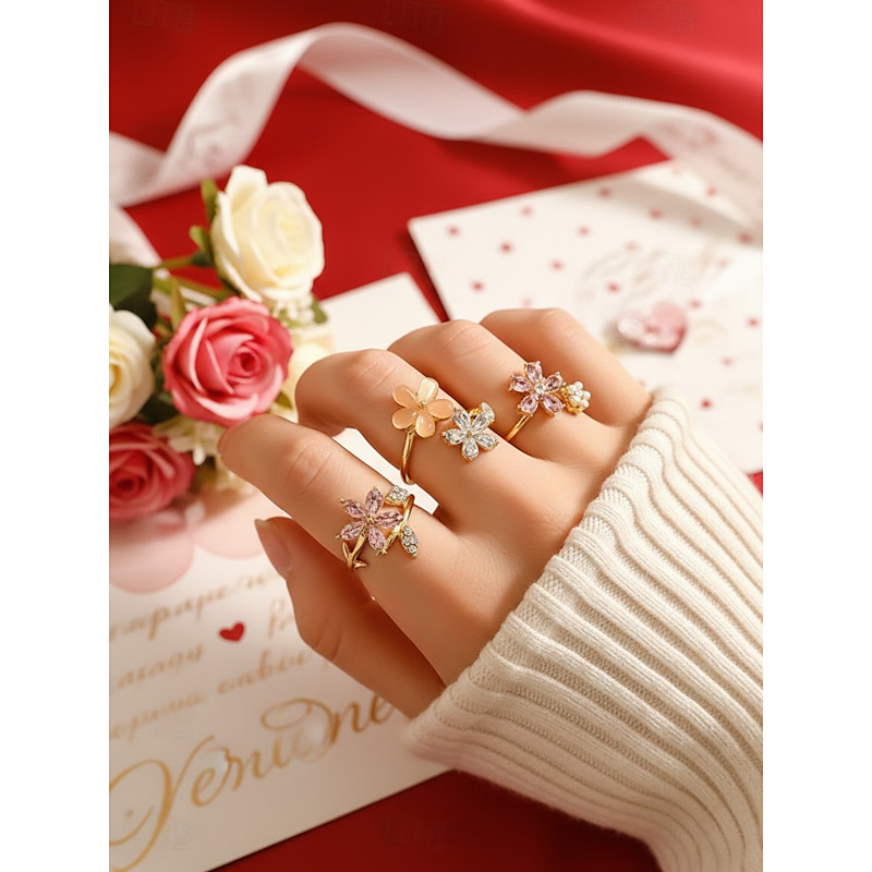 Women's Floral Ring Set for Valentine's Day – Gold-Plated Adjustable Rings with Colorful Gemstones, Perfect for Special Occasions