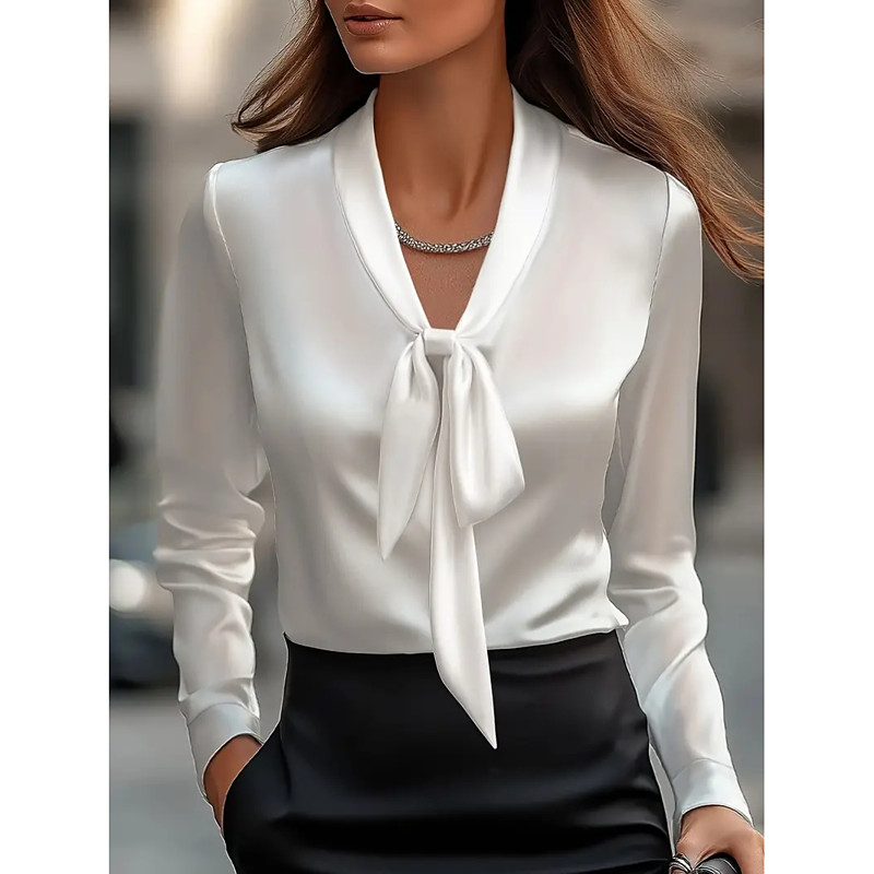 Women's Satin Dressy Elegant Long Sleeve Cowl Neck Blouse White Solid Color Tunic Tops for Office Work White Black Purple Champagne