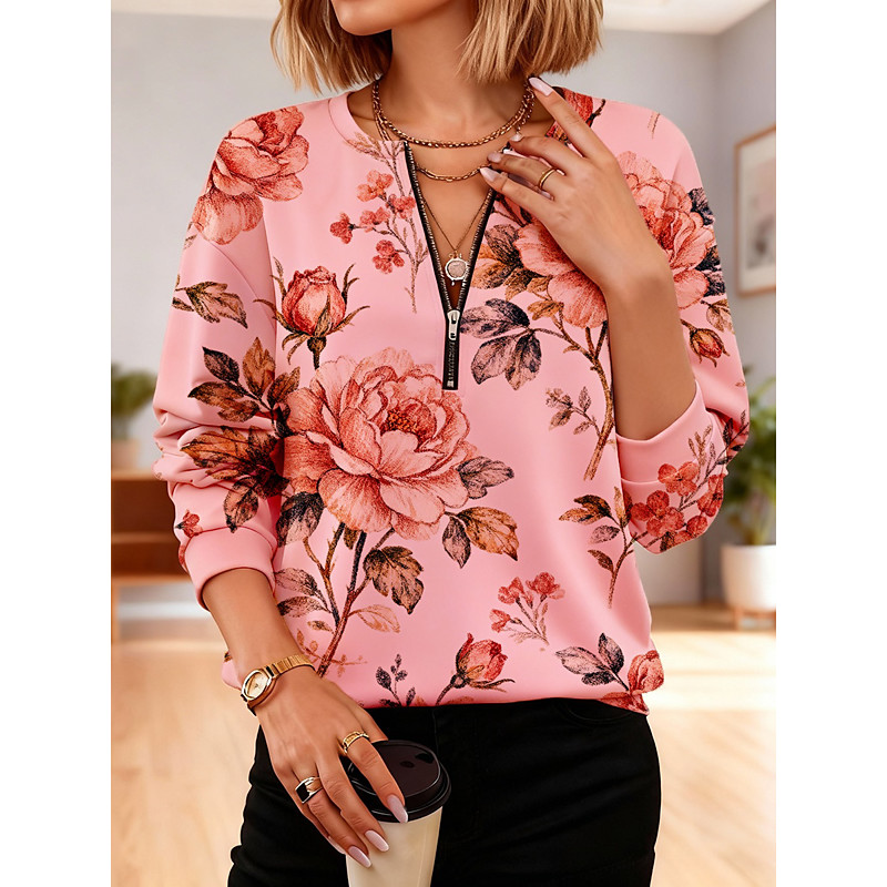Women's Pullover Sweatshirt Zip Up Sweatshirts Floral Fashion Casual Long Sleeve Crew Neck Regular Tops Street Dailywear Casual Zipper Print Yellow Pink Green Spring Fall Winter