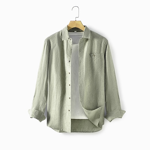 100% lino Tasche Per uomo Camicia camicia di lino Camicia con bottoni Nero Bianco Verde Manica lunga Liscio Bavero Primavera Autunno Esterno Giornaliero Abbigliamento