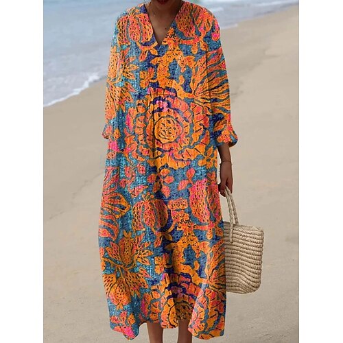 Per donna Abito maxi Abito a trapezio Vacanza Casual Boho Uscire Spiaggia Vestibilità comoda Floreale Grafico Manica Lunga Scollo a V Giallo Chiaro Rosa chiaro Rosa Viola Estate Primavera Autunno