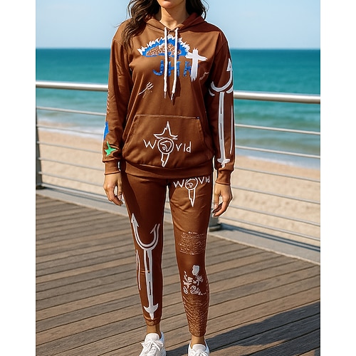 Per donna Tuta da 2 pezzi Felpa con cappuccio Lounge Set di tute da ginnastica Tasca Stampato Completo Abbigliamento Autunno Nero Bianco All'aperto Viaggio Sportivo Traspirante Manica Lunga Sport