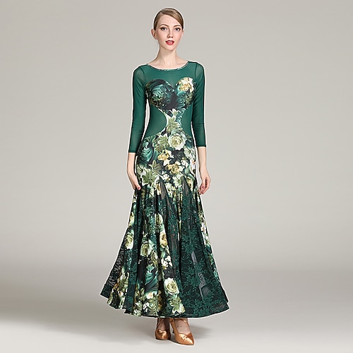 abito da ballo da sala da ballo floreale da donna, abito da valzer a maniche lunghe, gonna con inserti in pizzo, abito da competizione standard moderno, in rete verde con giunture in vita