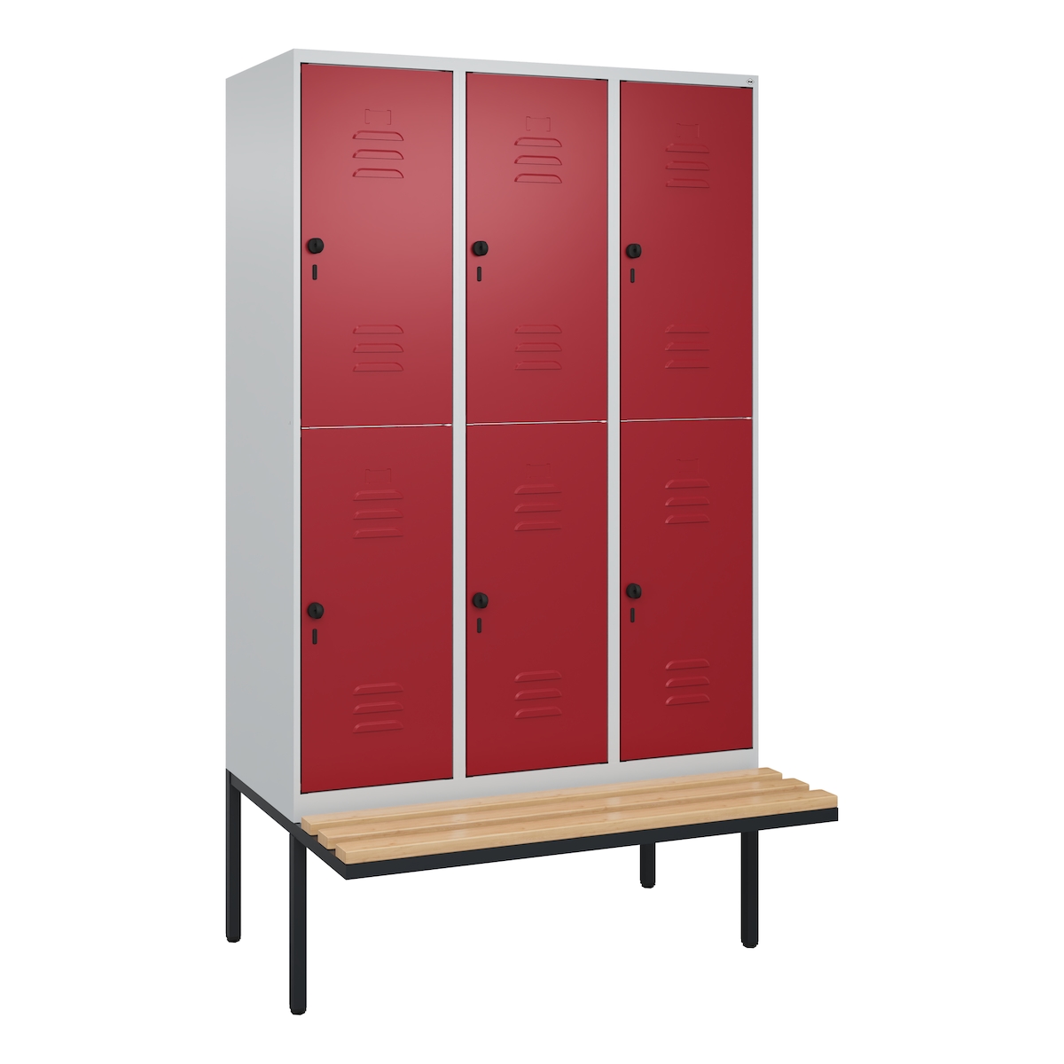 C+P Spind Classic PLUS, Buche schwebende Sitzbank, 6 Abteile, HxBxT 212x120x82cm, Sicherheitsdrehriegel, Hellgrau/Rubinrot von PROREGAL