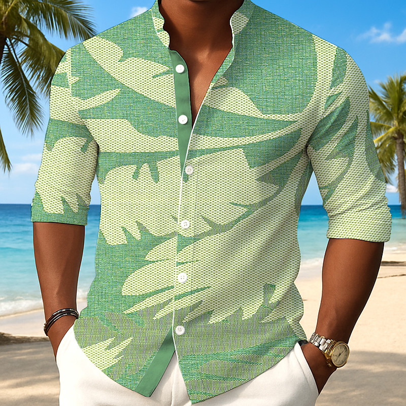 Men's Plants Palm Leaf Shirt Button Up Shirt Stand Collar Shirt Long Sleeve Casual Outdoor Vacation Daily Spring Fall Mandarin Collar Band Collar 3D Print Linen Like Shirt Pink Blue Green