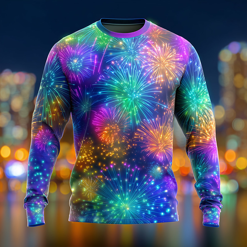 New Year Men's Fireworks T Shirt Long Sleeve T shirt 3D Print Crew Neck Shirt Exaggerated Designer Artistic Party Street Club Blue Black Purple Fall Winter Clothing Apparel S M L XL XXL XXXL