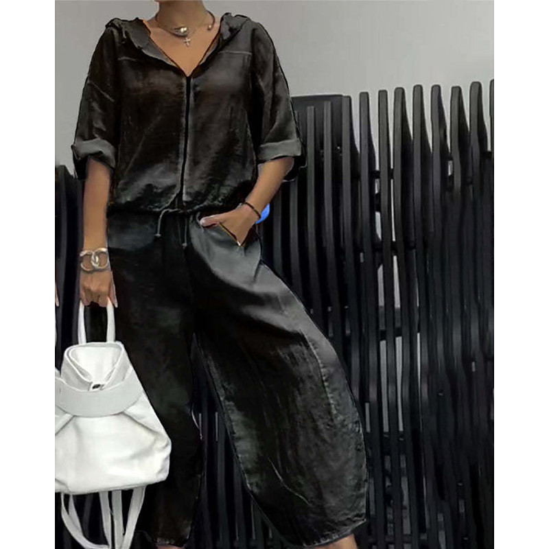 Women's Active Fashion Cotton Linen Shirts Blouse Pants Sets Long Sleeve Hooded Solid Color Zipper Daily Wear Date Black White Yellow Summer Regular Fit