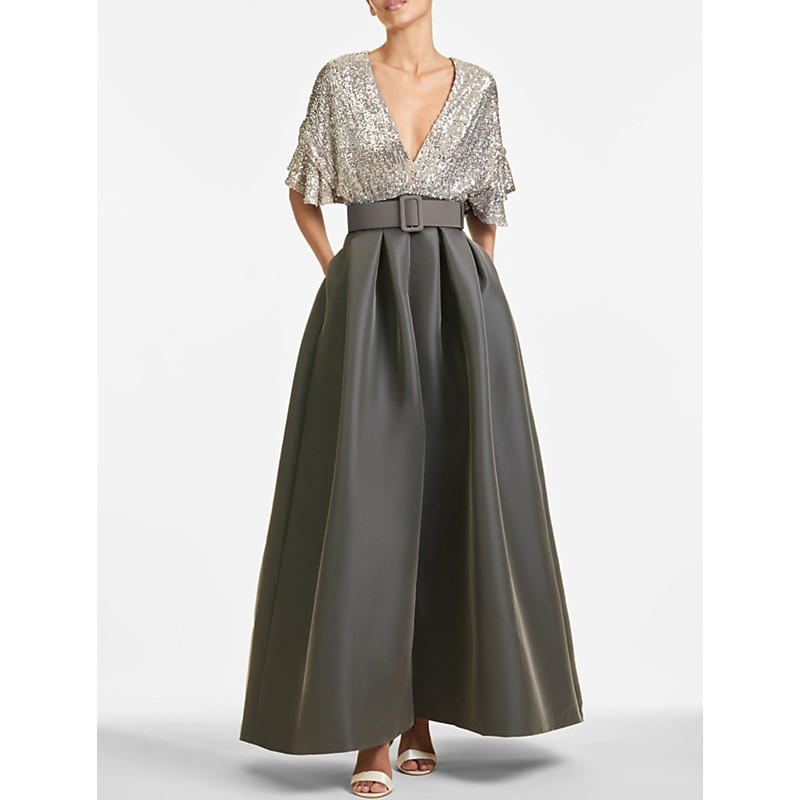 A-Line Ankle Length Evening Gown Ball Gown Formal Dress Elegant Sparkle Shine Half Sleeve V Neck Formal Wedding Guest Fall Wedding Guest Sequined with Sequin Strappy