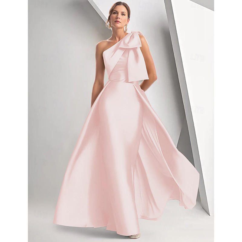 A-Line Floor Length Evening Gown Ball Gown with Overskirt Formal Dress Elegant Sleeveless One Shoulder Christmas Formal Fall Wedding Guest Satin with Bow(s)