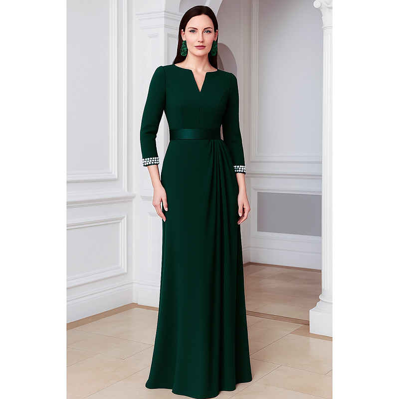 A-Line Floor Length Evening Gown Ball Gown with Overskirt Formal Dress Elegant 3/4 Length Sleeve Crew Neck Wedding Formal Stretch Satin with Pleats