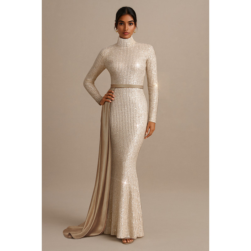 Mermaid Trumpet Floor Length Evening Gown Bodycon Dress Ball Gown with Overskirt Elegant Glittering Sparkle Long Sleeve High Neck Wedding Formal Sequined with Glitter