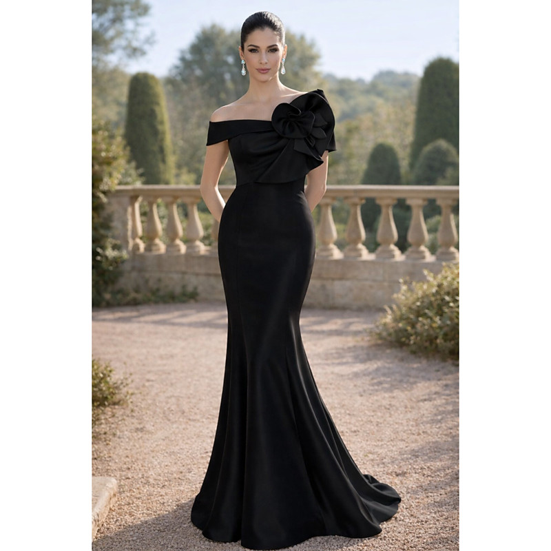 Mermaid Trumpet Floor Length Evening Gown Ball Gown Formal Dress Elegant Silky Short Sleeve Off Shoulder Wedding Formal Pocket Satin with Embroidered Flower