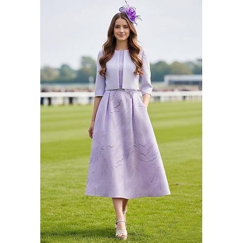 Linea ad A Lunghezza Tè Abito da invitata a nozze Abito da cerimonia per signora Senza Maniche Manica 3/4 Collo quadrato Elegante Festa in giardino Matrimonio Formale Crepe Elasticizzato con Tasca