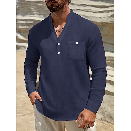 Per uomo Camicia Camicia di lino Stile vichingo Camicia Estiva Abbigliamento da spiaggia Tinta unica Vacanza Streetwear Nero Bianco Blu marino Blu Manica Lunga Henley Estate Primavera Abbigliamento