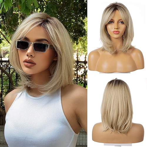 blonde Perücken für Frauen, Ombre-Perücke in Hellblond mit Pony, geschichtet, mittellang, Kunsthaarperücke mit dunklen Haarwurzeln für die tägliche Party
