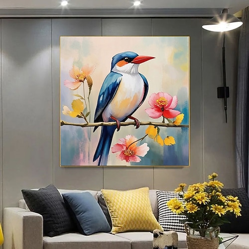 dipinto a mano, dipinto a olio di uccelli colorati, ramo floreale, stile impressionista, arte su tela, natura, fauna selvatica, decorazione murale, dipinto di animali, uccello bianco e blu