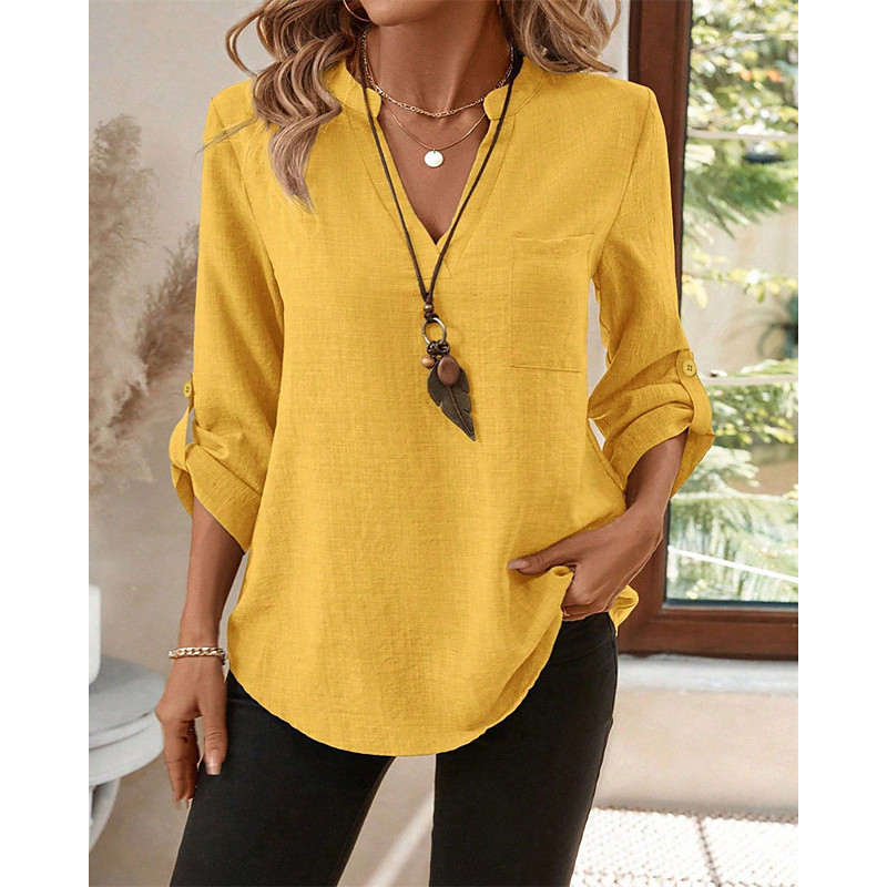 Women's Summer Tops Blouse Dressy Tops Solid Color Plain Elegant Vintage Ladies 3/4 Length Sleeve Shirt Collar Regular Tops Daily Work Going out Ruched Patchwork Pocket Blue Yellow Purple Green Khaki