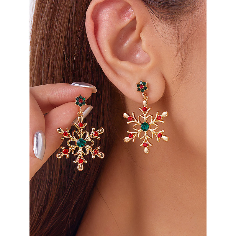 Women's Christmas Snowflake Earrings – Alloy and Faux Pearl Materials, Festive Red, Green, and Clear Stones, Perfect for Holiday Parties and Gifts