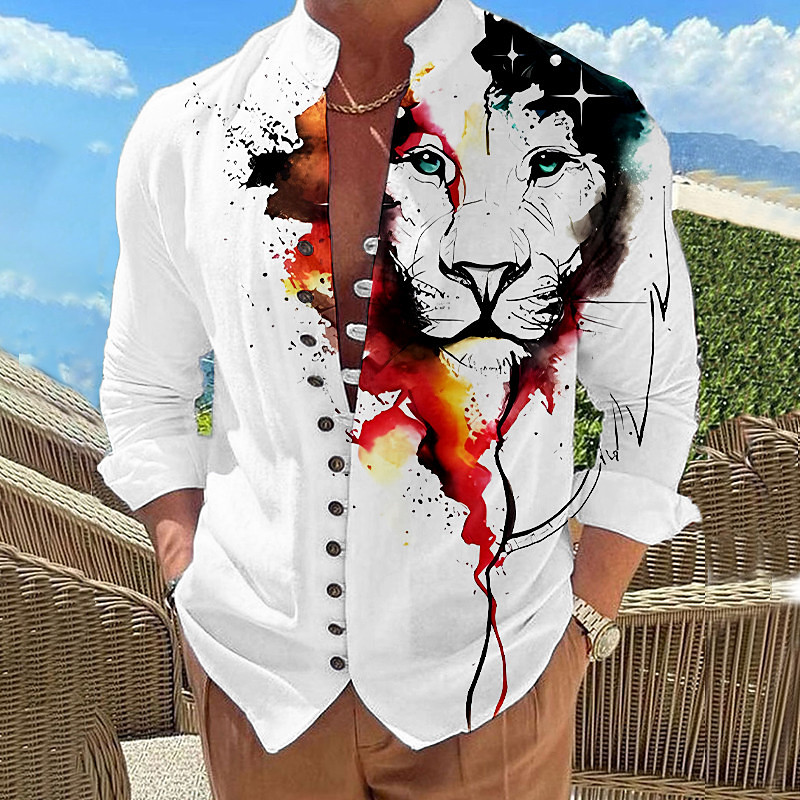 Men's Animal Lion Shirt Button Up Shirt Long Sleeve Fashion Designer Casual Vacation Daily Going out Fall Autumn / Fall Spring Summer Stand Collar Print Black Yellow Pink Blue Purple