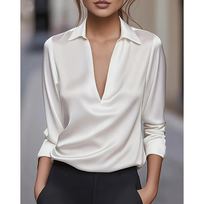 Women's Satin Dressy Elegant Long Sleeve V-Neck Collared Blouse Casual Business Work Shirt Black White Wine Dusty Blue Fall