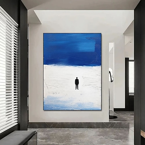 Minimalistische Strandkunst, 100 % handgemaltes blau-weißes Strand-Ölgemälde, moderne blaue Landschaft, Wohndekoration, zeitgenössische Wandkunst