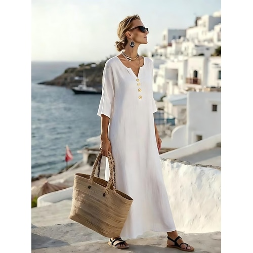 Per donna Abito maxi Finto cotone e lino Vestito a caftano Vestito Casual Abito in cotone Essenziale Classico Casual Quotidiano All'aperto Vacanza Vestibilità comoda Semplice Manica Lunga Scollo a V