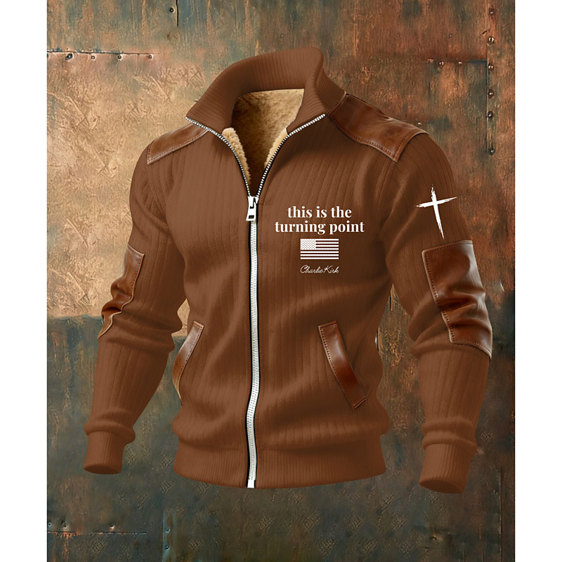 Men's Full Zip Hoodie Fleece Jacket Fleece Hoodie Black White Army Green Navy Blue Brown Standing Collar Cross American Flag Pocket Faux Leather Accents Sports Outdoor Casual Daily Polyester