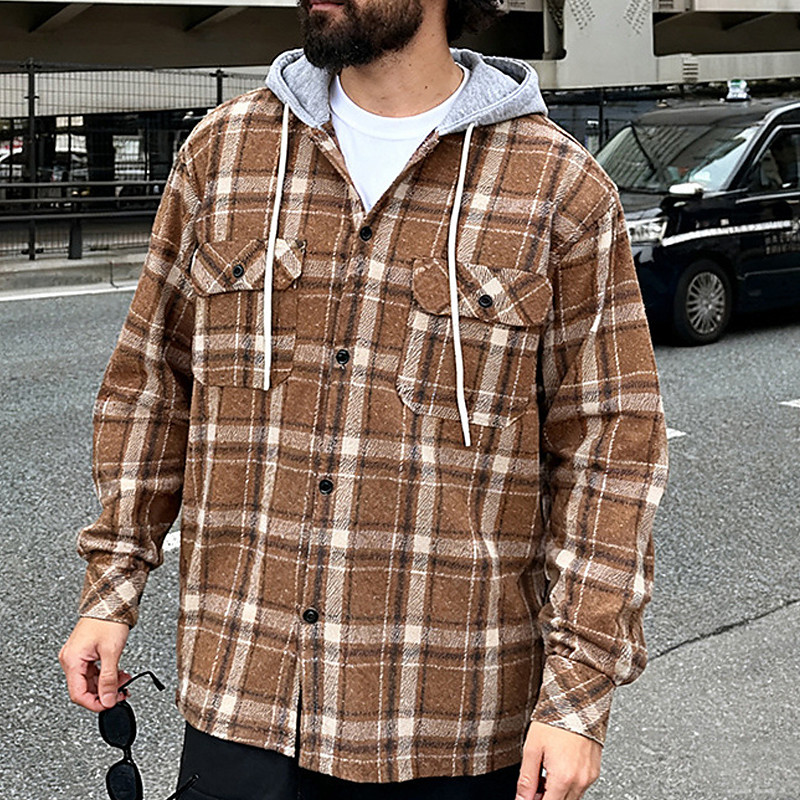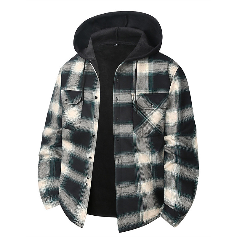 Men's Shacket Shirt Jacket Winter Jacket Plaid Vacation Daily Wear Red Sky Blue Dark Green Orange Long Sleeve Hooded Fall Winter Clothing Apparel Front Pocket